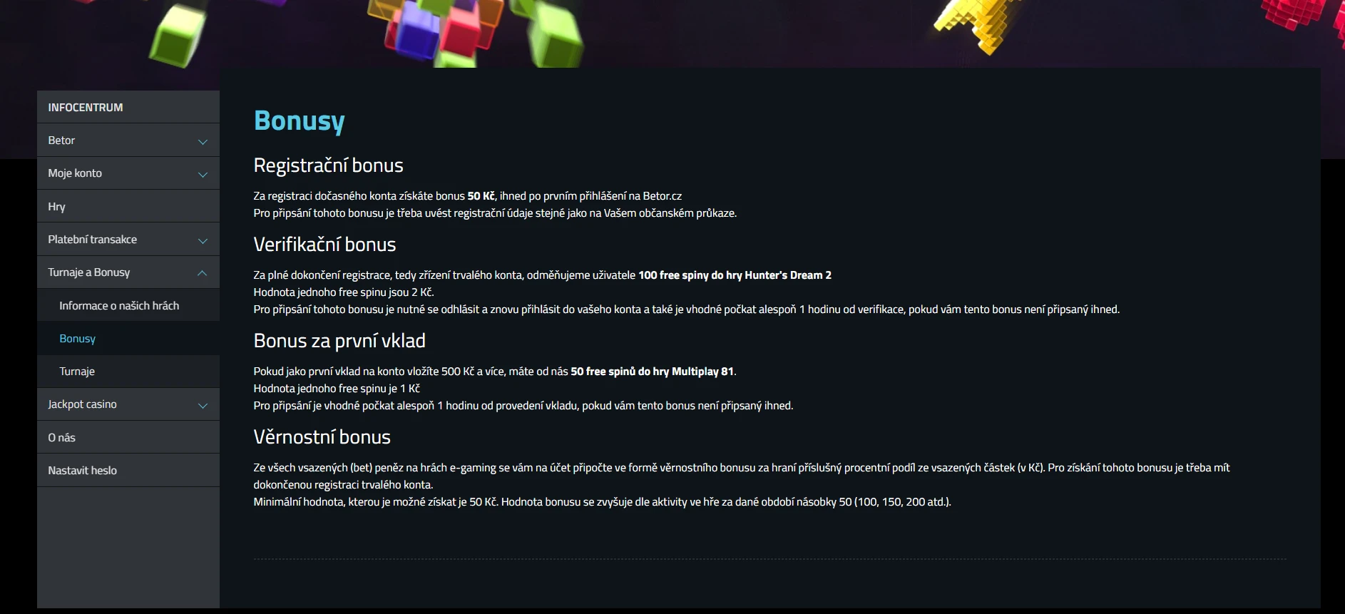 Za každé vsazené peníze ve hře vám Betor casino přičte na účet odměnu. Minimální výše odměny je 50 Kč. S aktivitou se zvyšuje připisovaná částka. Bohužel, přesná pravidla věrnostního programu nenajdete nikde na webu, ani v obchodních podmínkách, ani v herním plánu.