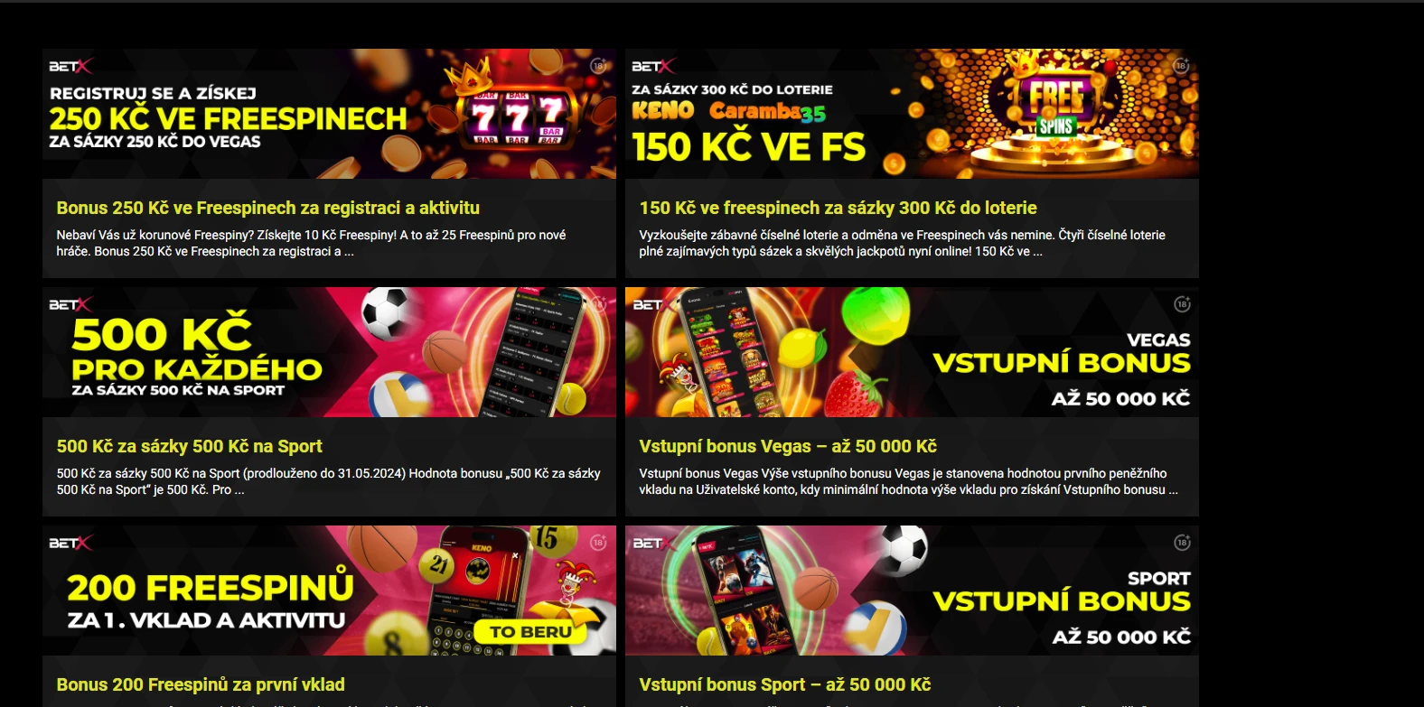 Za dokončení registrace získáte, jak už jsme uvedli, 25 volných spinů v hodnotě 10 Kč. Ovšem BetX na volných spinech nešetří ani v případě aktivity stálých hráčů. Dalších 200 volných spinů v celkové hodnotě 200 Kč dostanete za první vklad v minimální hodnotě 300 Kč, pokud ho učiníte do 24 hodin od dokončení registrace. Další volná zatočení používá BetX casino pro hráče, kteří už dříve navštěvovali kamenné pobočky. Pokud takoví hráči provedou registraci do online casina, získají okamžitě 50 volných spinů v celkové hodnotě 50 Kč.
