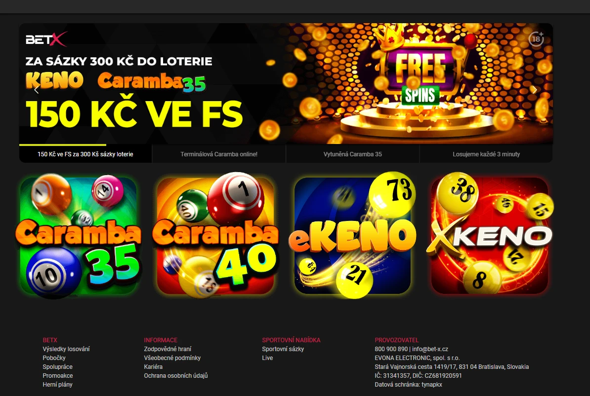 Skvělou stránkou online casina BetX je jeho loterie. V číselné loterii si můžete vybrat ze 4 her. Caramba 35, Caramba 40, eKeno a xKeno. Online loterie cílí mimo jiné i na hráče z terminálů, protože ti tyto loterie dobře znají z kamenných poboček. Losování probíhá nonstop, respektive každé 3 minuty celých 24 hodin. Výsledky losování si pak můžete prohlédnout v samostatné záložce.