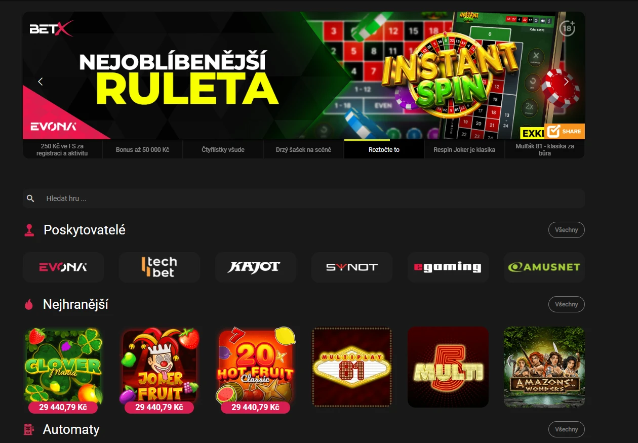 Online casino BetX patří k novým hráčům na českém trhu. Tato společnost s dlouhou tradicí na sousedním Slovensku získala licenci od Ministerstva financí ČR až v roce 2024. Od té doby svou nabídku služeb rozšiřuje, své služby zdokonaluje a snaží se prosadit v konkurenci ostatních legálních online casin. Zaměřuje se především na herní automaty, ruletu tu najdete pouze pro zpestření a jako bonus vytuněnou loterii, kterou znají hráči z kamenných poboček. Ta se v online casinu losuje nonstop každé 3 minuty a hráči si mohou vybrat ze 4 loterií. Automaty v casinu nabízí BetX od 8 různých výrobců, téměř všechny (a to téměř považujeme za jasnou nevýhodu) si můžete vyzkoušet v demo režimu. Nejoblíbenějším automatům dominují klasiky s ovocem, žolíky případně čtyřlístky, ale najdete tu i originální grafiky třeba z amazonského pralesa.