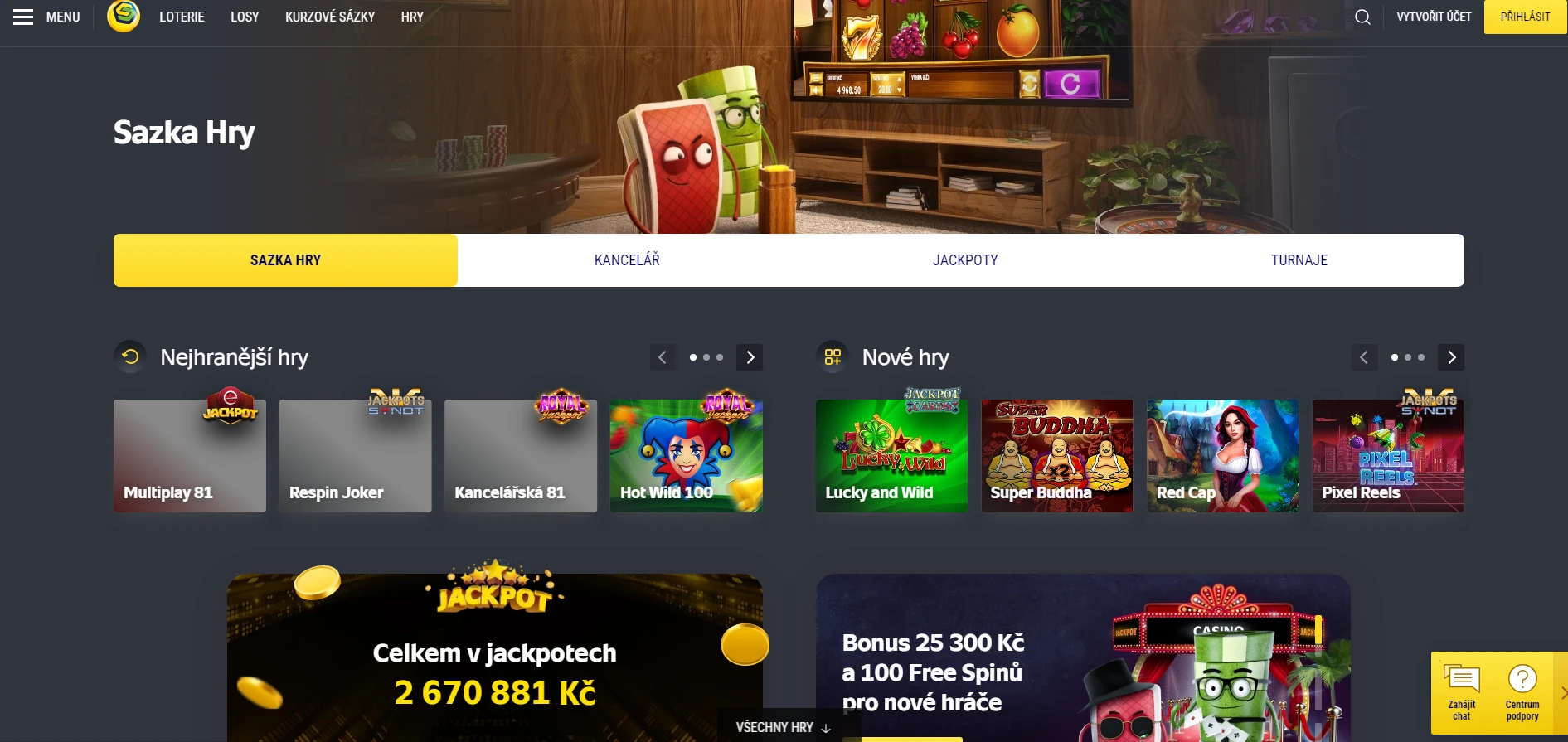 Sazka provozuje kromě mnoha loterií a kurzovních sázek také online kasino. Tzv. Sazka hry nabízí stovky her od renomovaných výrobců. Pro nové sázkaře nabízí Sazka za dokončení registrace 300 Kč a 100 volných spinů, ktreré můžete protočit na automatu Kancelářská 81. Licenci pro provoz kasina získala Sazka už v roce 2017. Hrát můžete z webu i z mobilu, ale kasino nemá vlastní mobilní aplikaci. Hry jsou seřazeny přehledně, dobře se jimi filtruje a snadno najdete svého oblíbeného výrobce. Najdete zde všechny oblíbené sloty od firem jako NetEnt, Apollo nebo Synot. Celkem si můžete zahrát přes 450 her českých i zahraničních poskytovatelů.